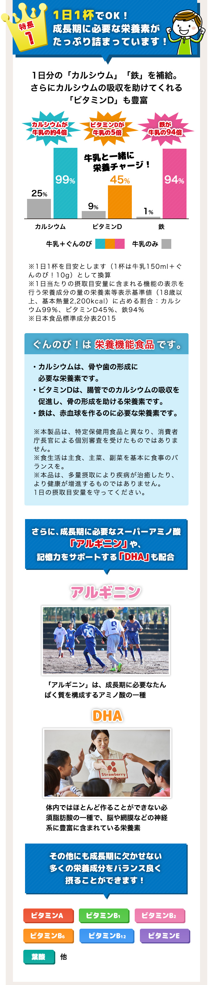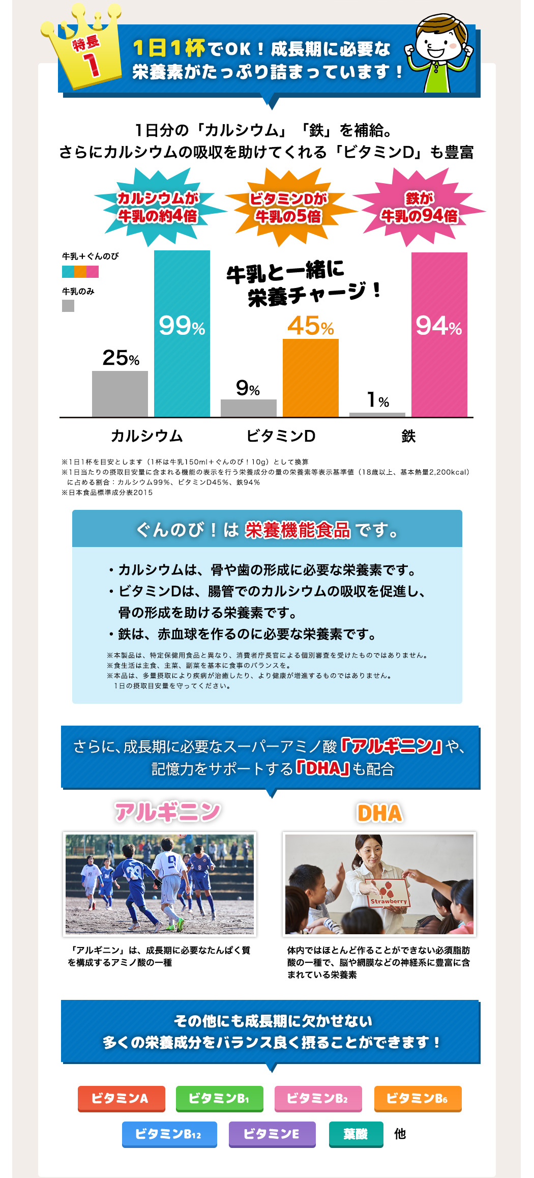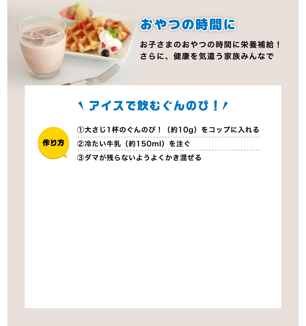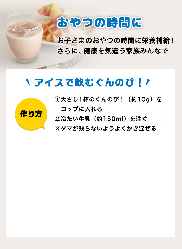 ●栄養成分・1杯(10g)当たり:エネルギー 29kcal、たんぱく質 0.5g、脂質 0.3g、炭水化物 6.3g、食塩相当量 0.004g、カルシウム 504mg、ビタミンD 2.0μg、鉄 6.40mg、ビタミンC 36.7mg、ビタミンA 308μg、ビタミンE 2.10mg、ビタミンB10.44mg、ビタミン B20.47mg、ビタミンB6 0.43mg、ビタミンB1 2 0.96μg、葉酸88μg、DHA 0.09mg、アルギニン1.00mg