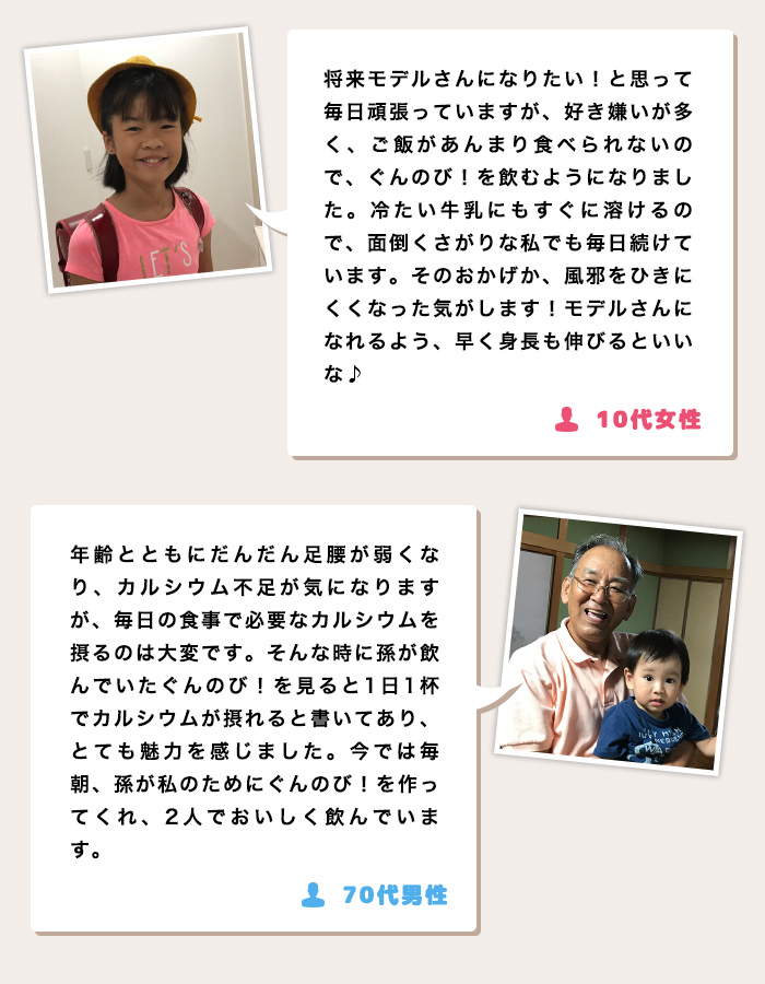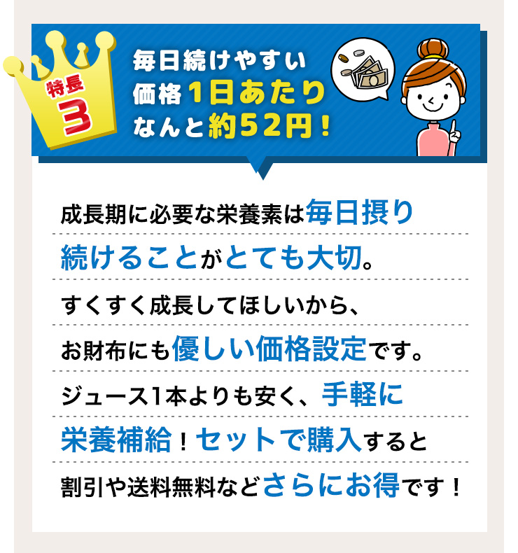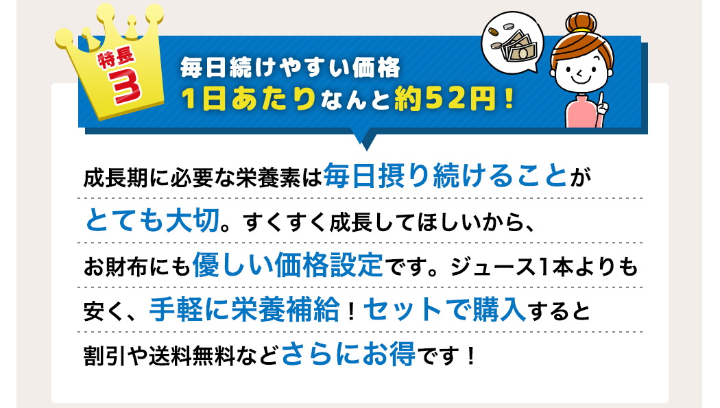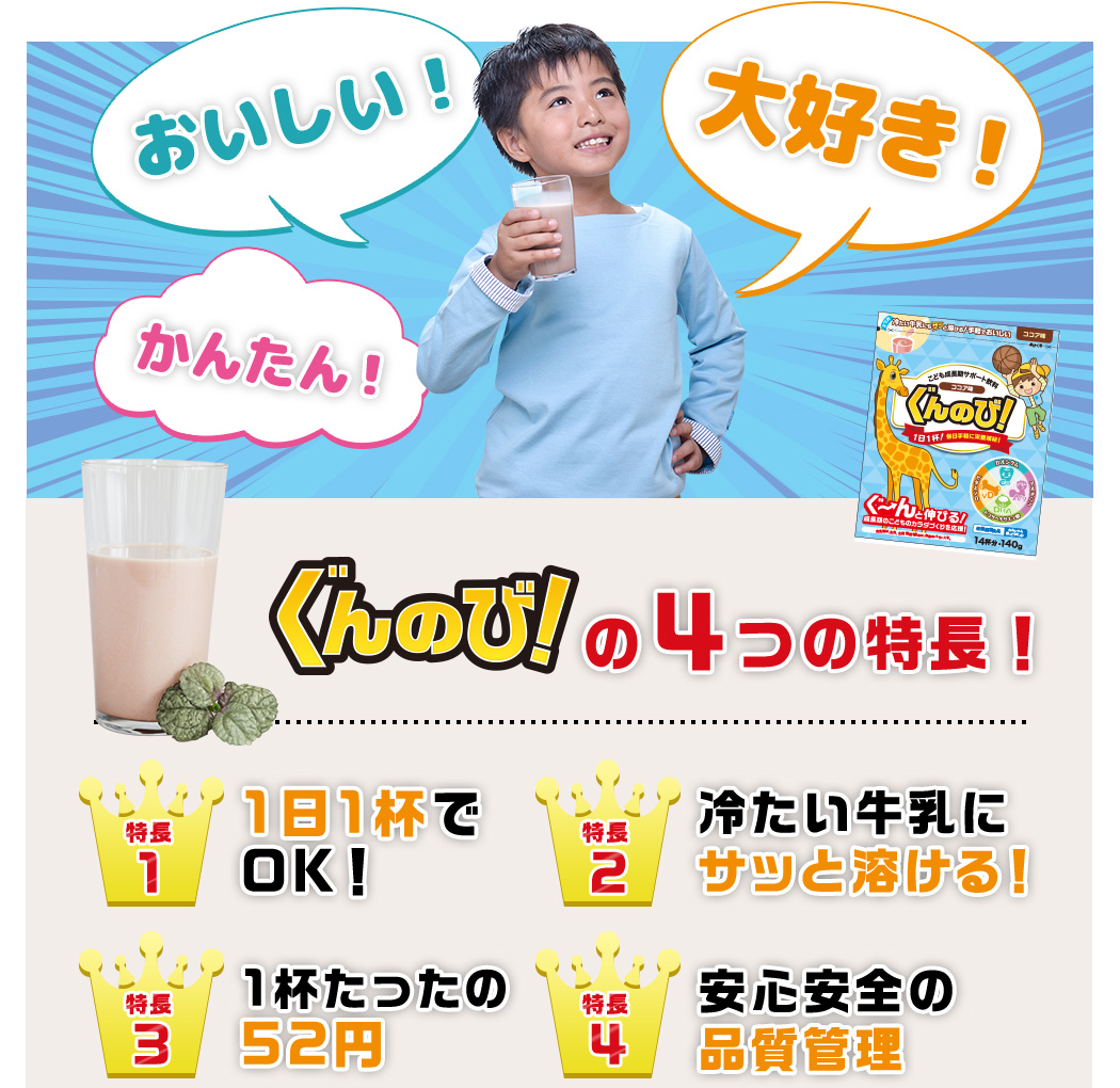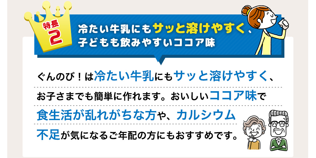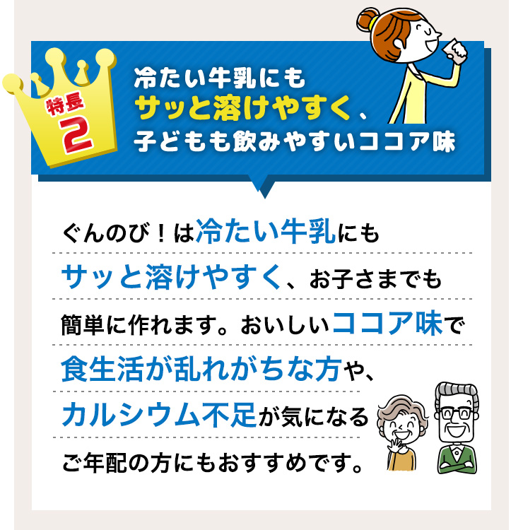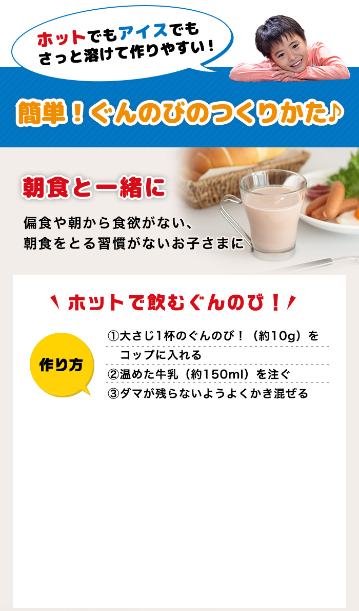 ●栄養成分・1杯(10g)当たり:エネルギー 29kcal、たんぱく質 0.5g、脂質 0.3g、炭水化物 6.3g、食塩相当量 0.004g、カルシウム 504mg、ビタミンD 2.0μg、鉄 6.40mg、ビタミンC 36.7mg、ビタミンA 308μg、ビタミンE 2.10mg、ビタミンB10.44mg、ビタミン B20.47mg、ビタミンB6 0.43mg、ビタミンB1 2 0.96μg、葉酸88μg、DHA 0.09mg、アルギニン1.00mg