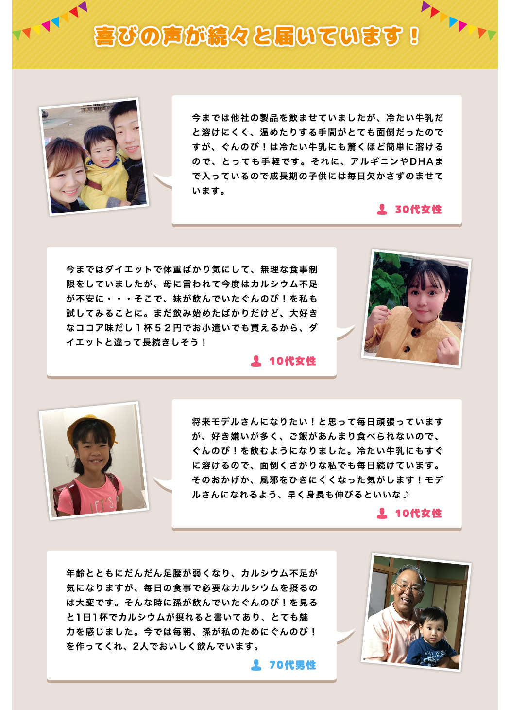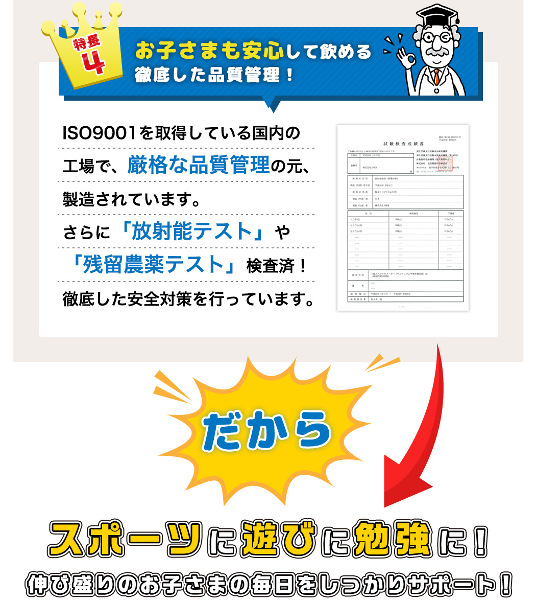 ●原材料:砂糖(国内製造)、ドロマイト、ココアパウダー、果糖、亜鉛含有酵母、DHA含有精製魚油(乳成分を含む)/乳化剤、V.C、ピロリン酸鉄、抽出V.E、ナイアシン、パントテン酸Ca、アルギニン、V.B1、V.B6、V.B2、V.A、葉酸、酸化防止剤(V.E、V.C)、V.D、V.B1 2